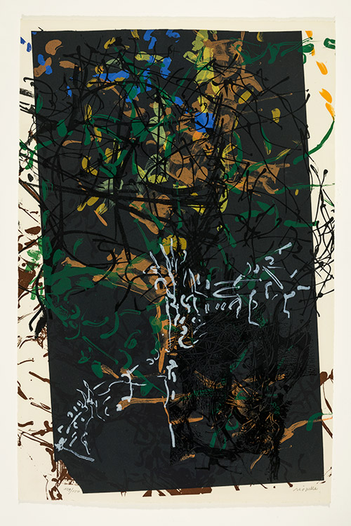 Riopelle s’est mis à la gravure (lithographie et eau-forte) seulement en 1967, soit près de 20 ans après le début de sa pratique de la peinture. Il est par la suite demeuré très fidèle à la gravure, la poursuivant en parallèle avec la peinture tout au long de sa carrière. Affiche avant la lettre de 1968 est une pièce produite par Riopelle au début de la lithographie alors qu’il en explorait toutes les possibilités. Il s’agit d’une des estampes les plus colorées de l’artiste. À l’image de sa peinture, on y perçoit des notes orangés, des bleus et des jaunes qui ressortent de façon très lumineuse comme dans un vitrail, avec un contraste réussi des couleurs sur un fond très foncé. Cette œuvre est l’une des estampes de Riopelle qui se rapproche le plus de sa pratique picturale.