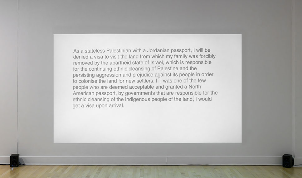 P pour Palestine est une exposition collective qui rassemble des œuvres conceptuelles, expérimentales et poétiques d’artistes de la Palestine et de la diaspora. Fondée sur la conviction que le langage est politique, l’exposition s’intéresse aux enjeux sémantiques et discursifs propres à la réalité palestinienne, tant actuelle que passée. Les œuvres sélectionnées partagent un lien particulier avec les mots — qu’ils soient écrits, signés ou parlés — pour évoquer, raconter ou encore nommer divers aspects de l’expérience palestinienne. Il en ressort des récits personnels qui brossent un tableau de la résistance et de la résilience face aux multiples formes de la violence coloniale. Dans le contexte où les voix palestiniennes sont souvent censurées ou peinent à se faire entendre, tant dans l’espace médiatique qu’artistique, l’exposition prend la forme d’une agora, d’un lieu de rencontres qui amplifie certaines de ces voix et ouvre un espace aux imaginaires palestiniens.